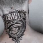 Tetování symboly, srdce, oko, hvězda, nápis na krk