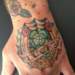 Tetování symboly štěstí, pavučina se čtyřlístkem, podkovou a nápisem na hřbetu ruky