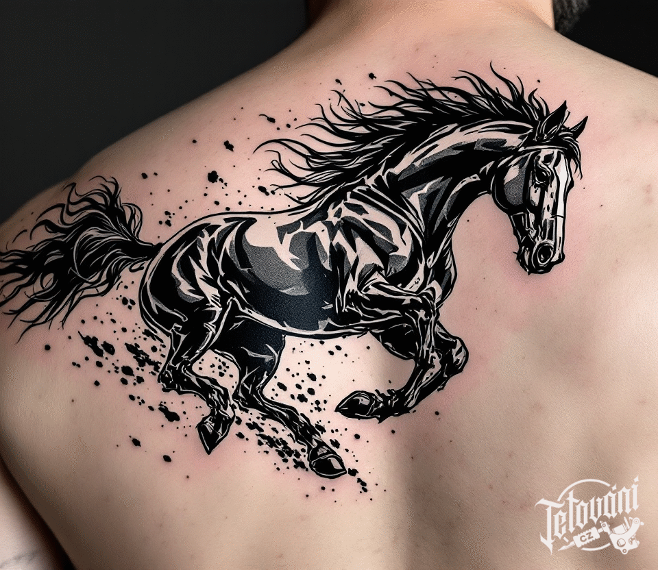 Tetování symboly svobody, černý kůň na lopatku