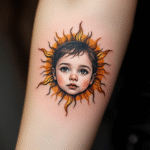 Tetování syn, dítě, slunce na předloktí