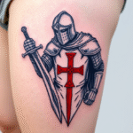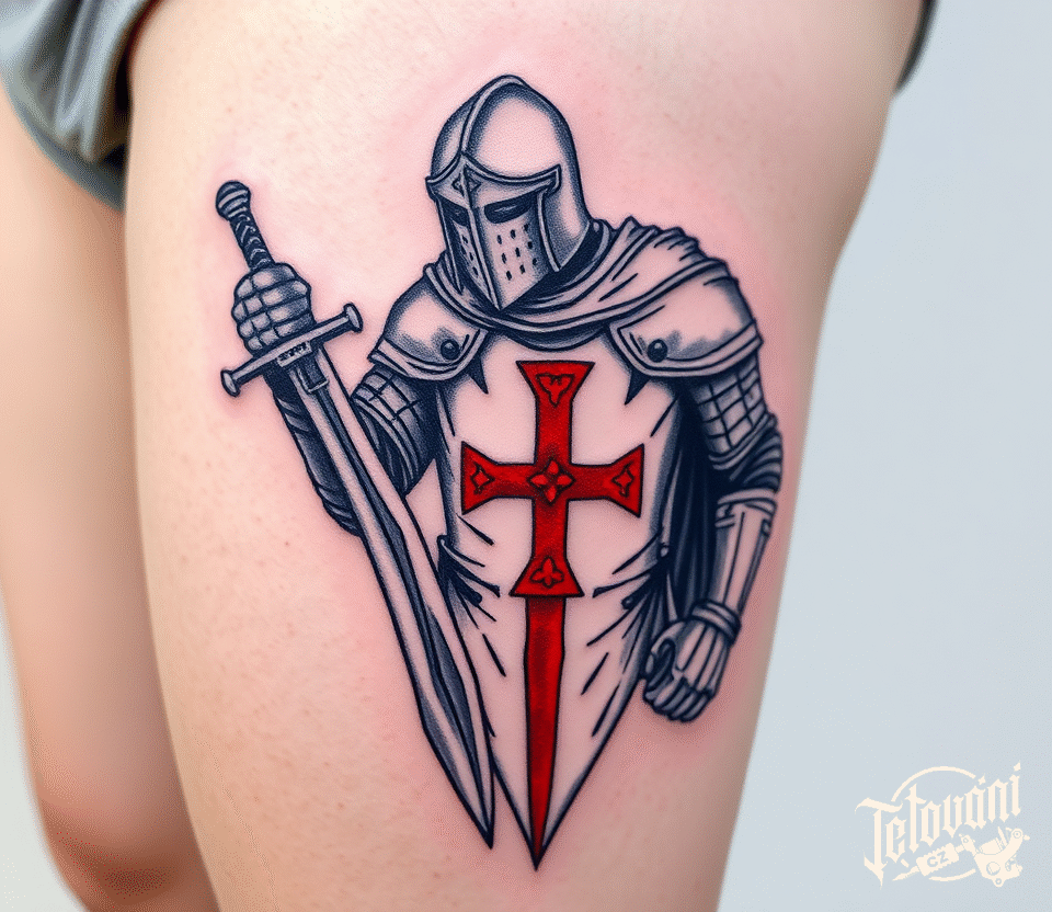 Tetování templář s mečem a templářský kříž na bok stehna