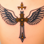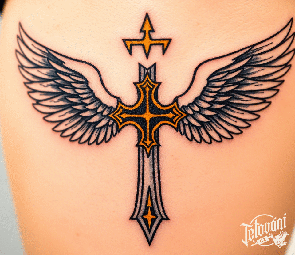 Tetování templářský kříž s křídly na předloktí