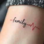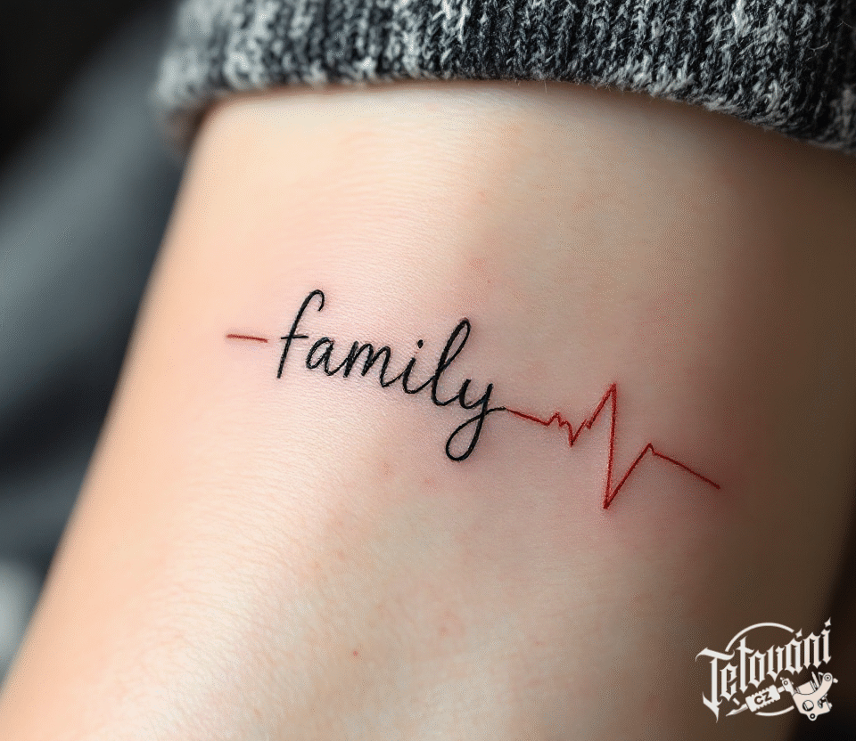 Tetování tep srdce a nápis family na předloktí
