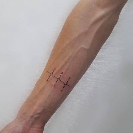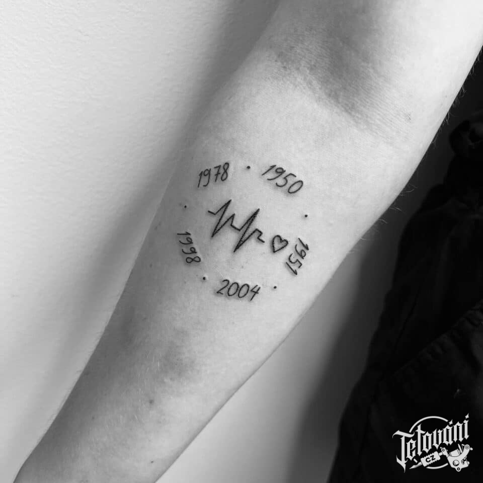 Tetování tep srdce, srdce a nápisy, čísla na předloktí