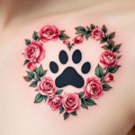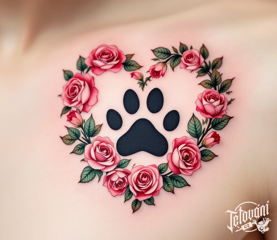 Tetování tlapka s srdce, květiny, růže na hrudník