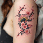 Tetování třešňové květy s vějířem na rameni