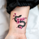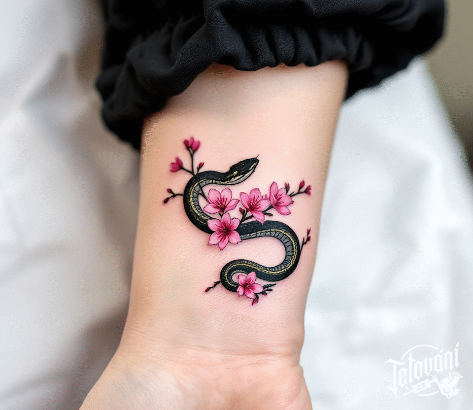 Tetování třešňový květ s hadem na předloktí