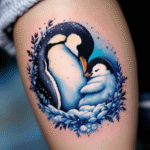 Tetování tučňák a mládě jako symbol mateřské lásky na lýtko