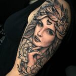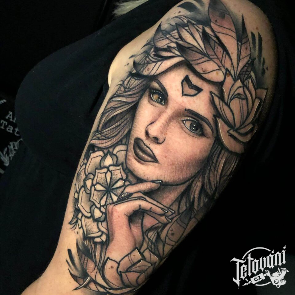 Tetování tvář ženy s listy a květinami na paži