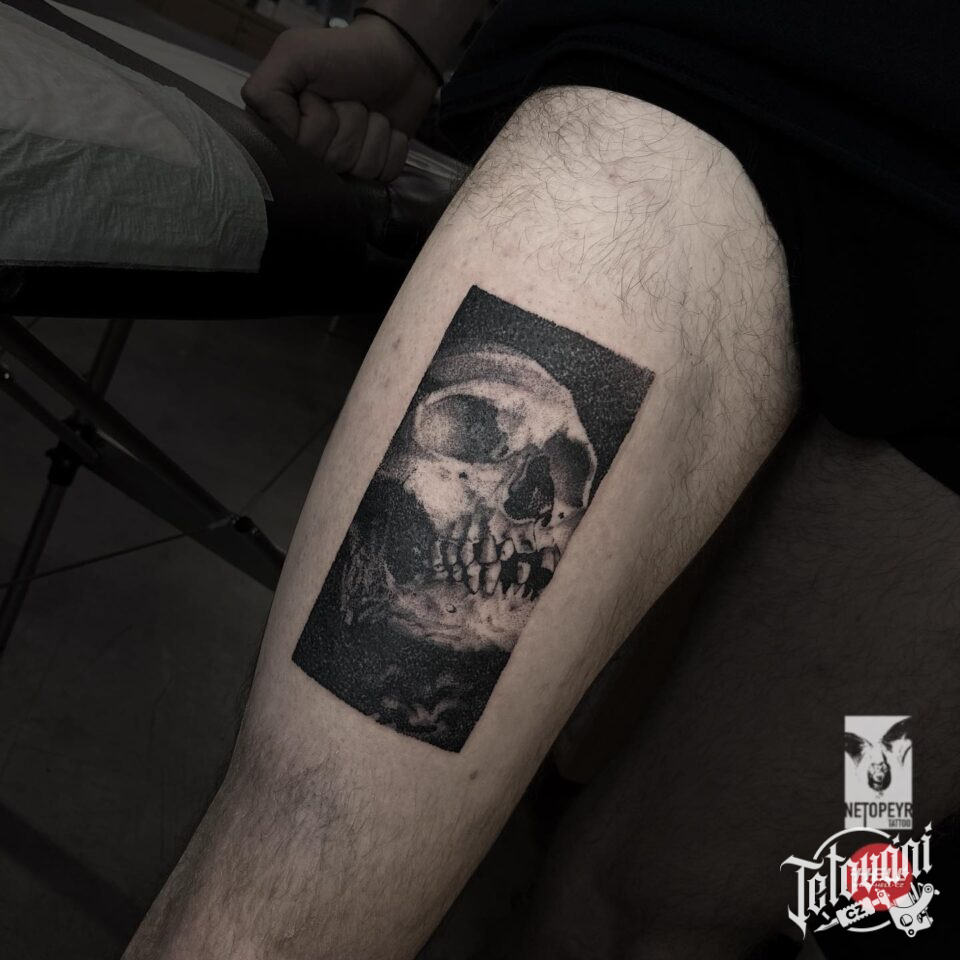 Tetování tvary, lebka na stehno