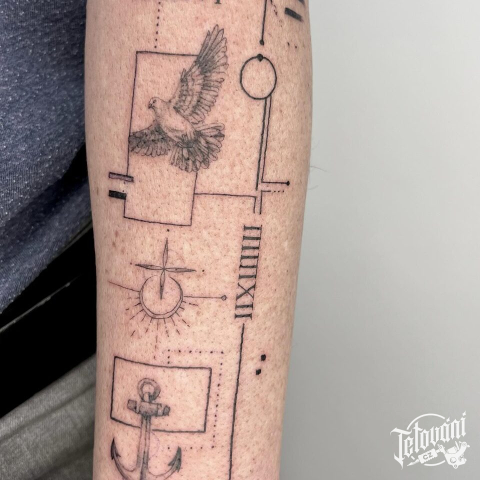 Tetování tvary, zvířata, holubice, čáry a čísla na předloktí