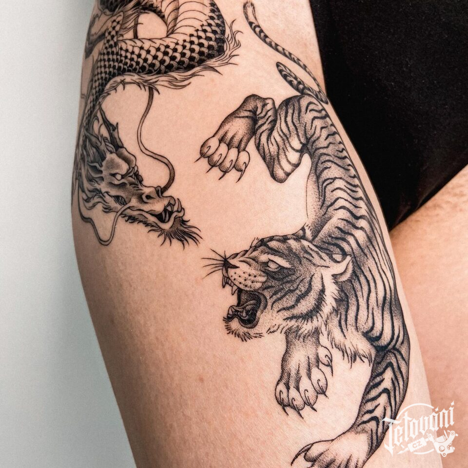 Tetování tygr na stehně
