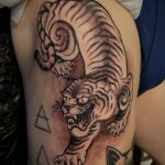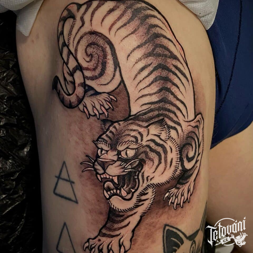 Tetování tygr na stehně