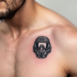 Tetování válečné motivy, předměty, helma pod klíční kostí