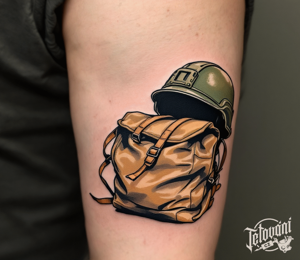 Tetování válečné motivy, vojáci, předměty, batoh s helmou na ruce
