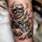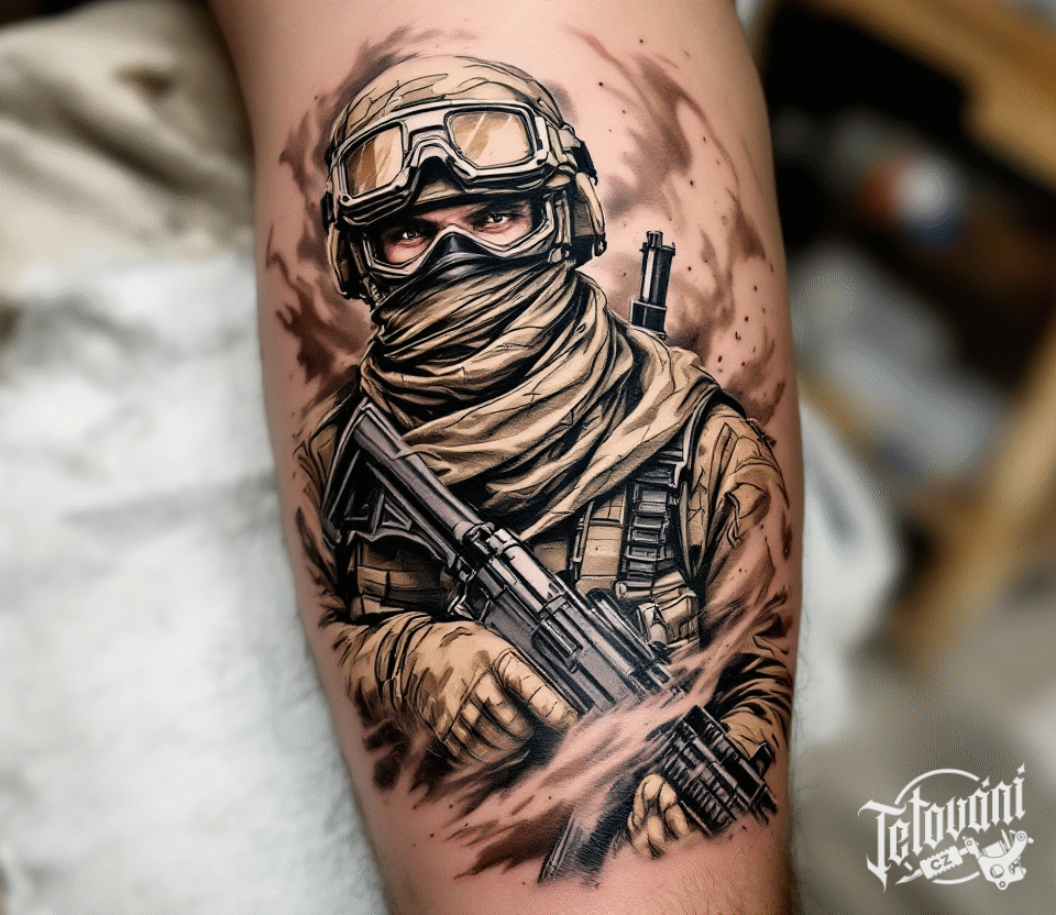 Tetování válečné motivy, voják se zbraní na lýtku