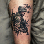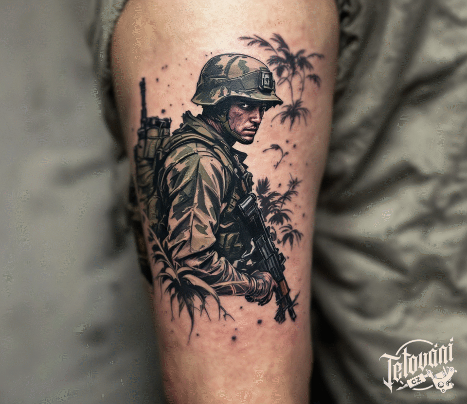 Tetování válečné motivy, voják se zbraní na lýtku