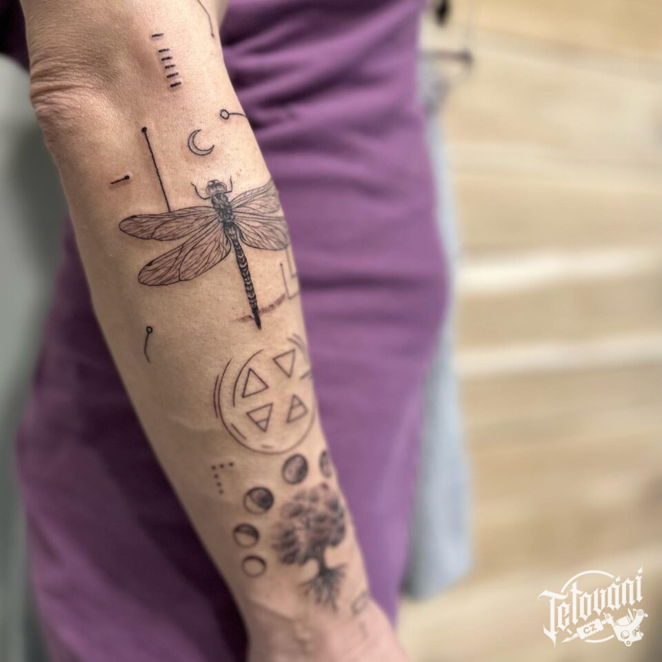 Tetování vážka a symboly na předloktí