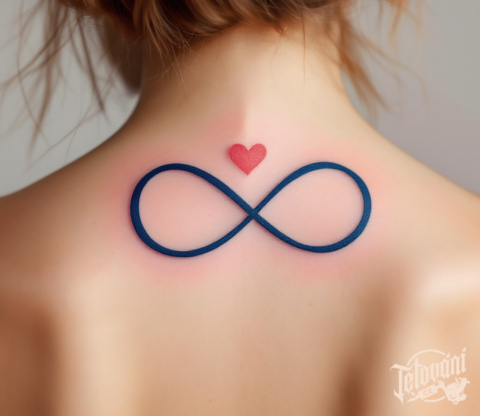 Tetování velká ležatá osmička, nekonečno srdce na zádech