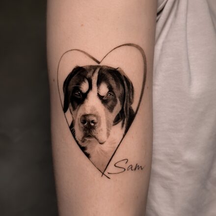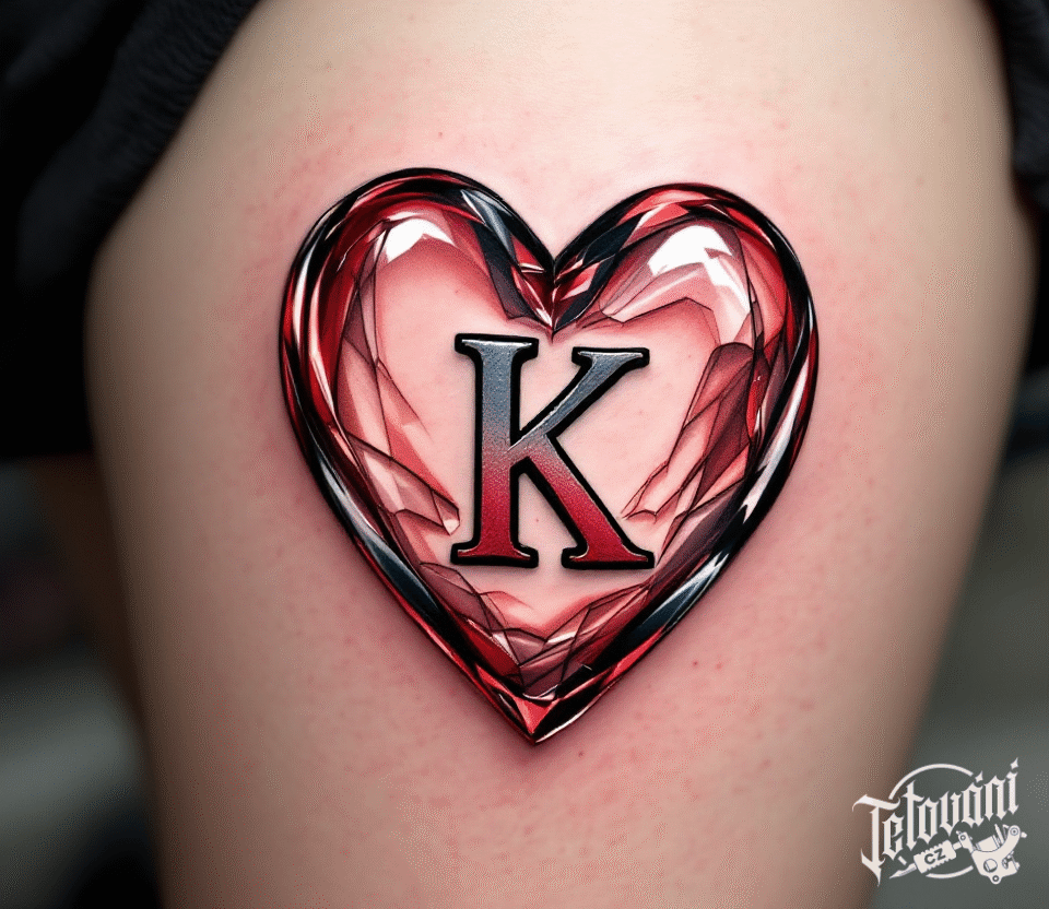 Tetování velké srdce a srdce s písmenem K na boku stehna