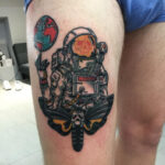 Tetování vesmír, astronaut a smrtihlav na stehně