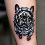 Tetování vesmír, francouzský buldoček astronaut na předloktí