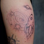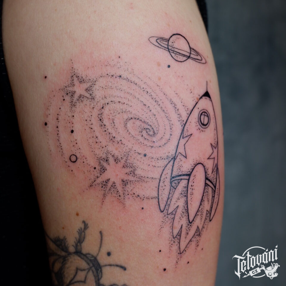 Tetování vesmír, galaxie, planety, raketa na rameni