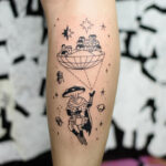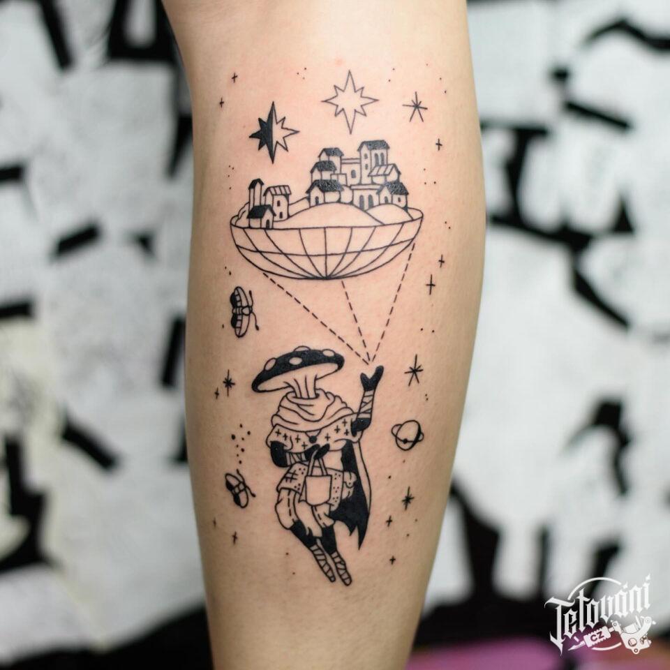 Tetování vesmír, hvězdy, cestování, planety, domy na lýtku