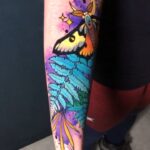 Tetování, vesmír, hvězdy, můra, luční kvítí na předloktí
