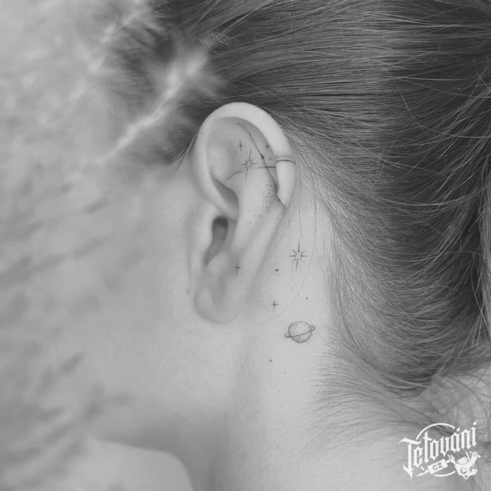 Tetování vesmír, hvězdy, planeta za uchem