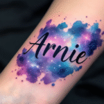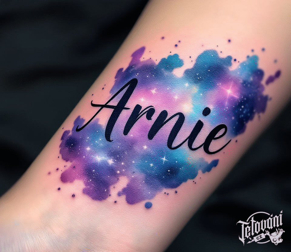 Tetování vesmír, jméno dítěte, syn na předloktí