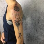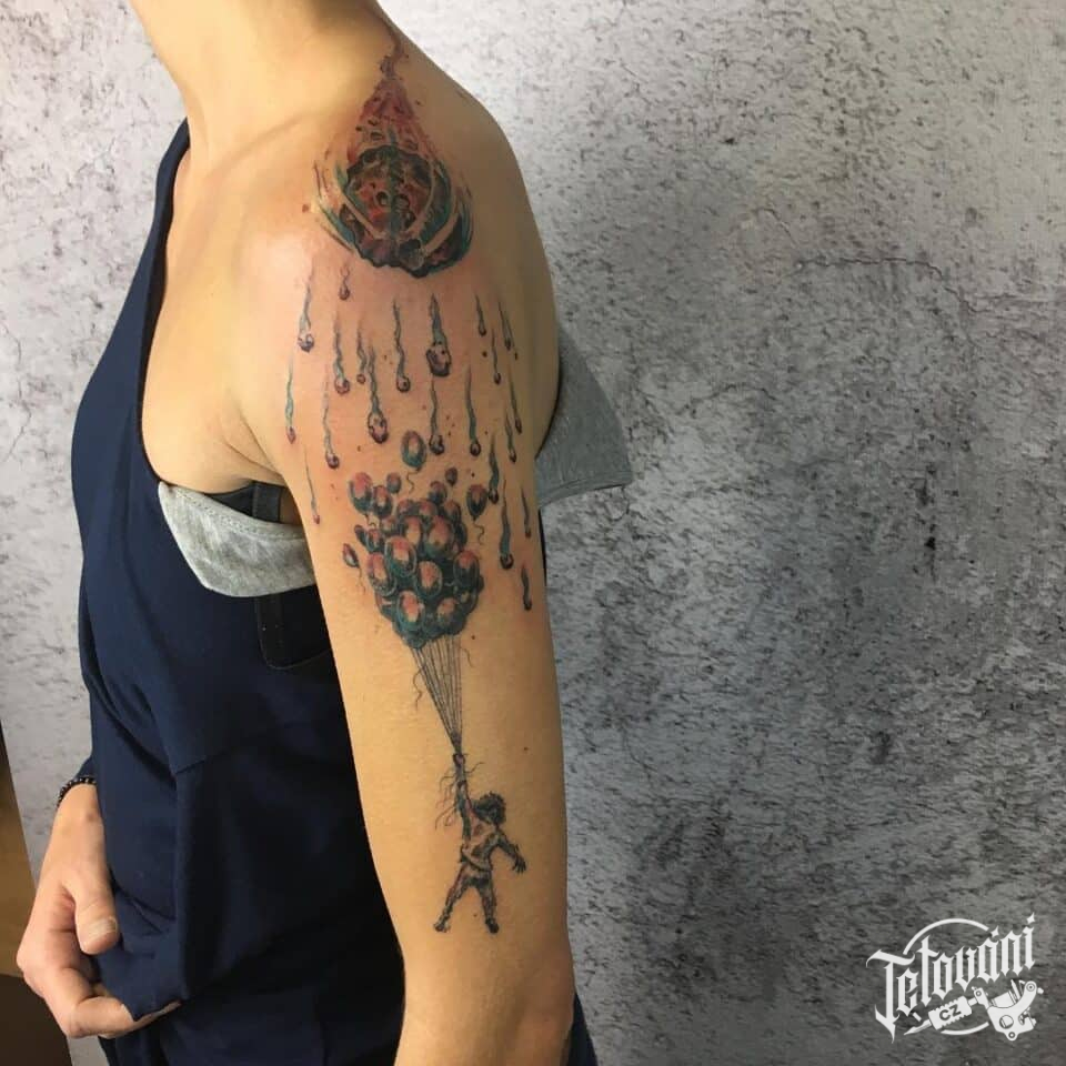 Tetování vesmír, padající asteroidy, postavička na rameni