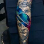 Tetování vesmír, planeta a portrét na lýtku