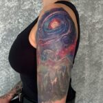 Tetování vesmír, planety a les s horami na rameni