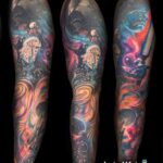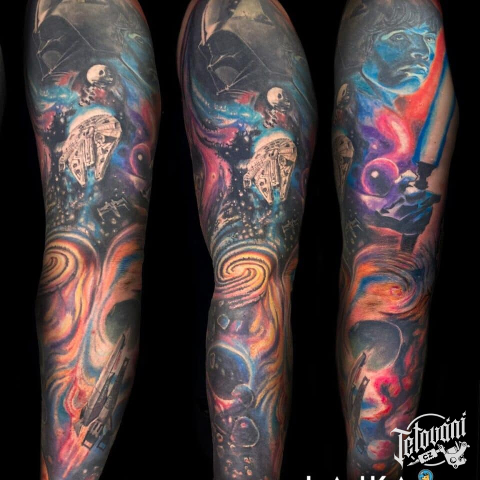 Tetování vesmír, planety a rytíř z filmů a pohádek na rukávu