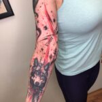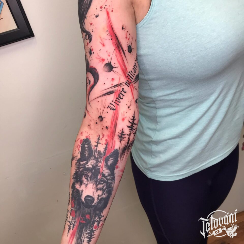 Tetování vesmír, planety a zvíře, vlk na ruce