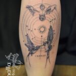Tetování vesmír, planety, Slunce, zvířata, ptáci, ruce na lýtku