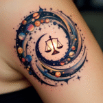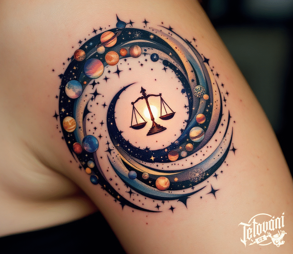 Tetování vesmír, planety, váhy znamení zvěrokruhu, karma na rameni