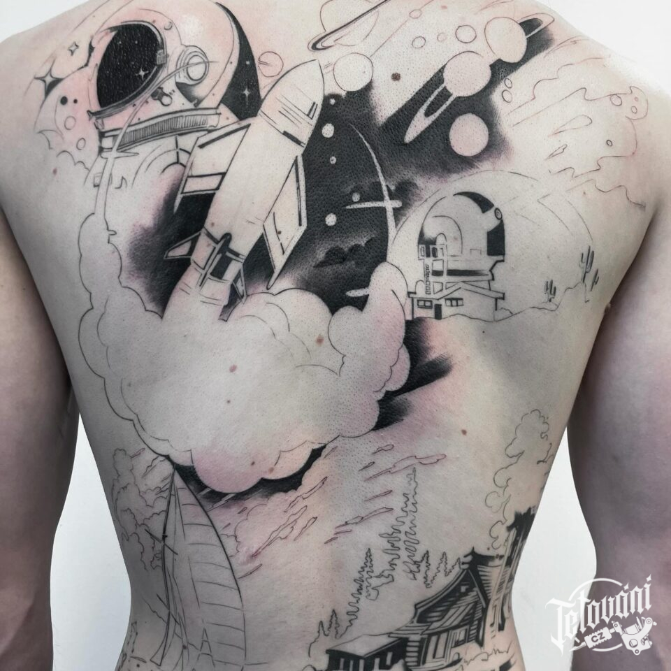 Tetování vesmír, příroda, les na záda