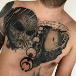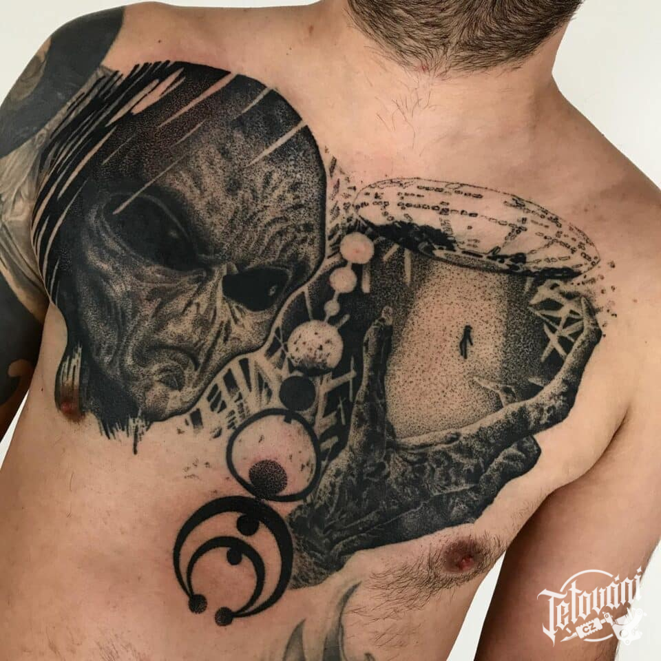 Tetování vesmír, ruka, portrét, ufo na hrudi