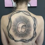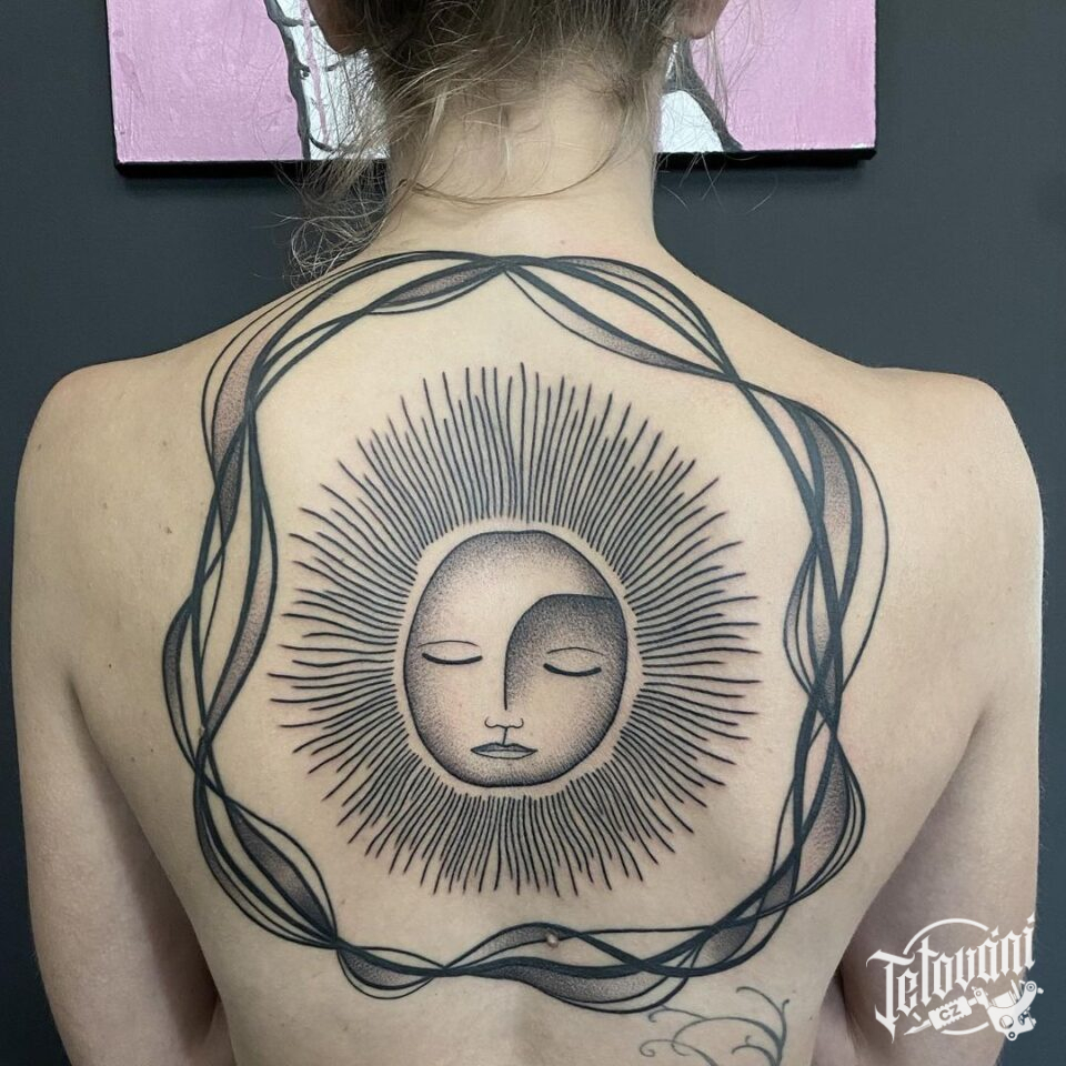 Tetování vesmír, slunce a čáry na zádech