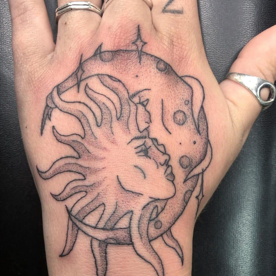 Tetování vesmír, Slunce a Měsíc na hřbetu ruky