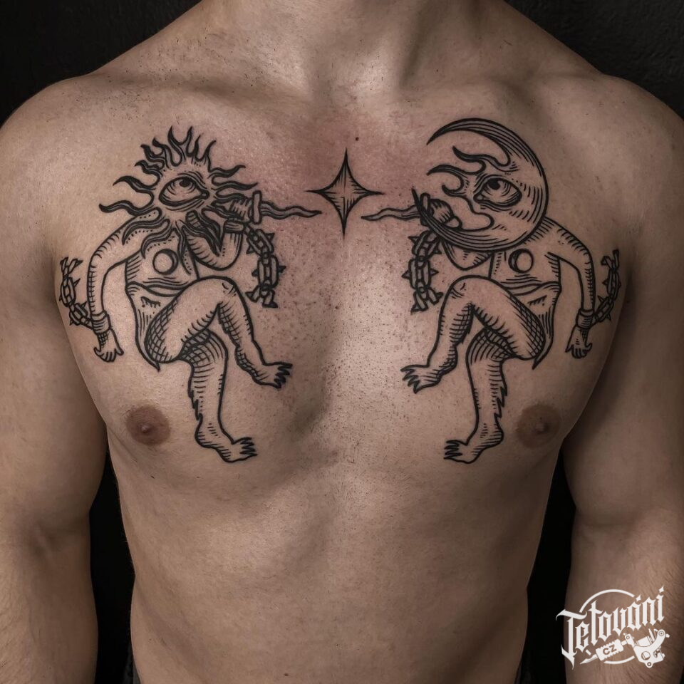 Tetování vesmír, Slunce a Měsíc, tanečníci na hrudi