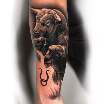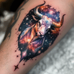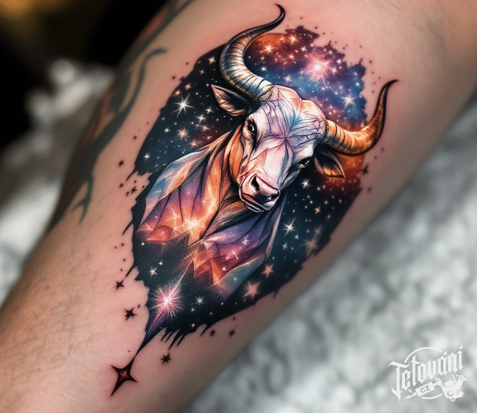 Tetování vesmír, souhvězdí býka, hlava býka na předloktí