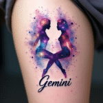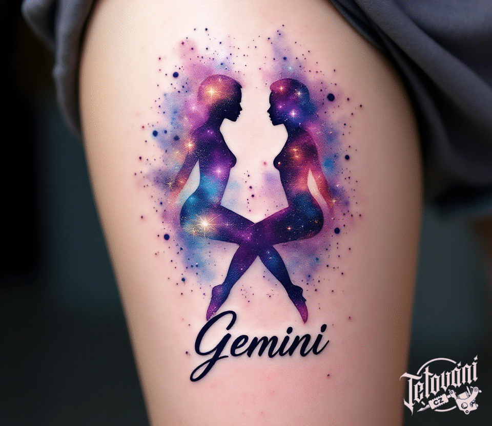 Tetování vesmír, ženy, nápis a blíženci znamení zvěrokruhu na stehně
