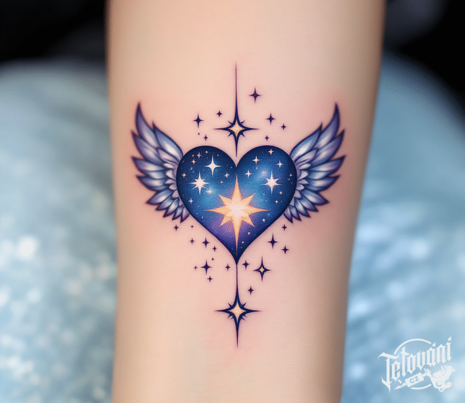 Tetování vesmírné srdce s křídly na předloktí