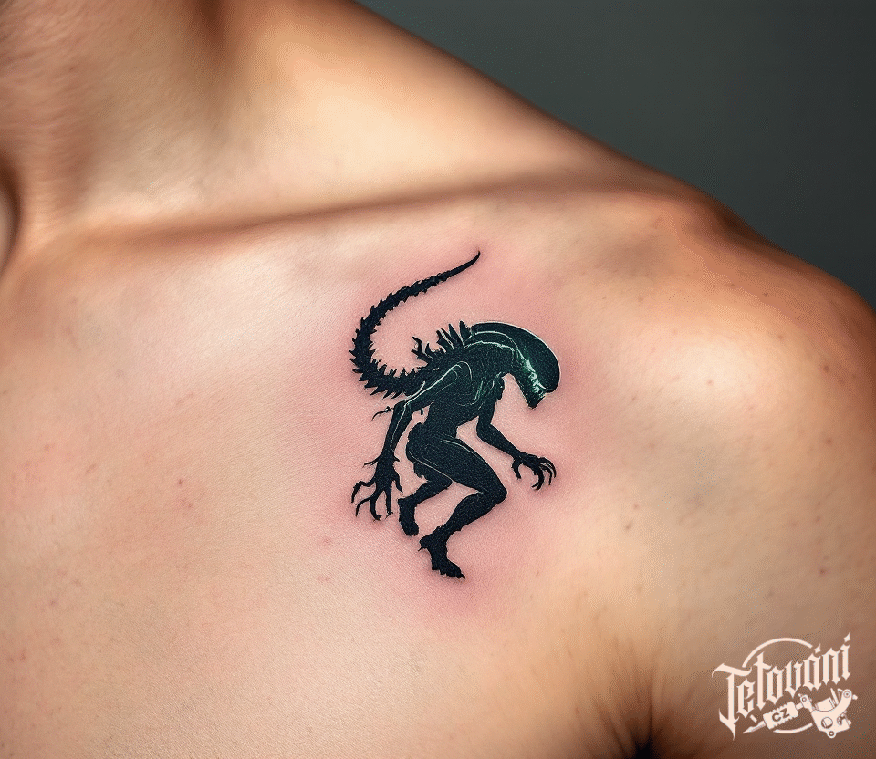 Tetování vetřelec z filmů a pohádek, nadpřirozená bytost pod klíční kostí