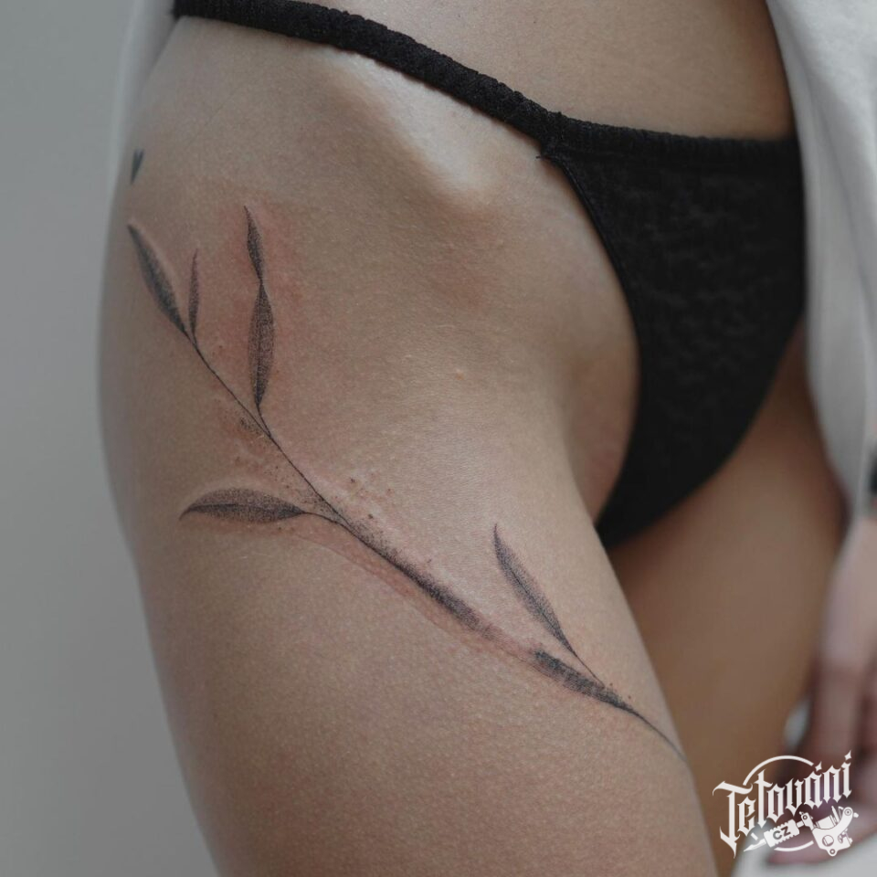 Tetování větvička na boku stehna