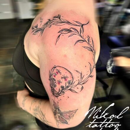 Tetování větvička s lebkou, květinami a hřiby na ruce