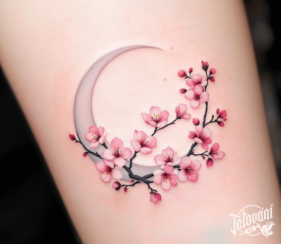 Tetování větvička, třešňový květ a Měsíc na předloktí